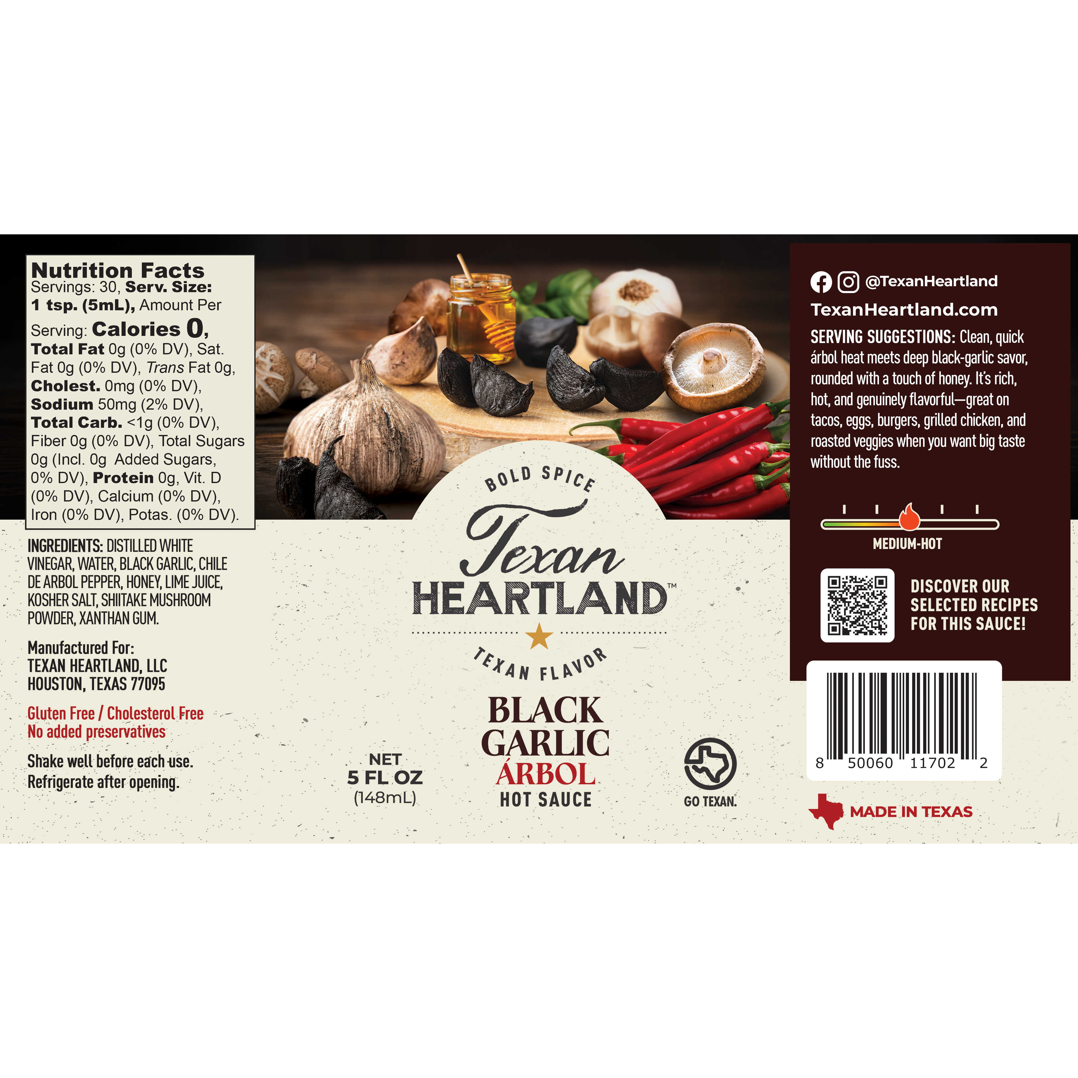 INGREDIENTS: Distilled White Vinegar, Water, Black Garlic, Chile De Arbol Pepper, Honey, Lime Juice, Kosher Salt, Shiitake Mushroom Powder, Xanthan Gum.