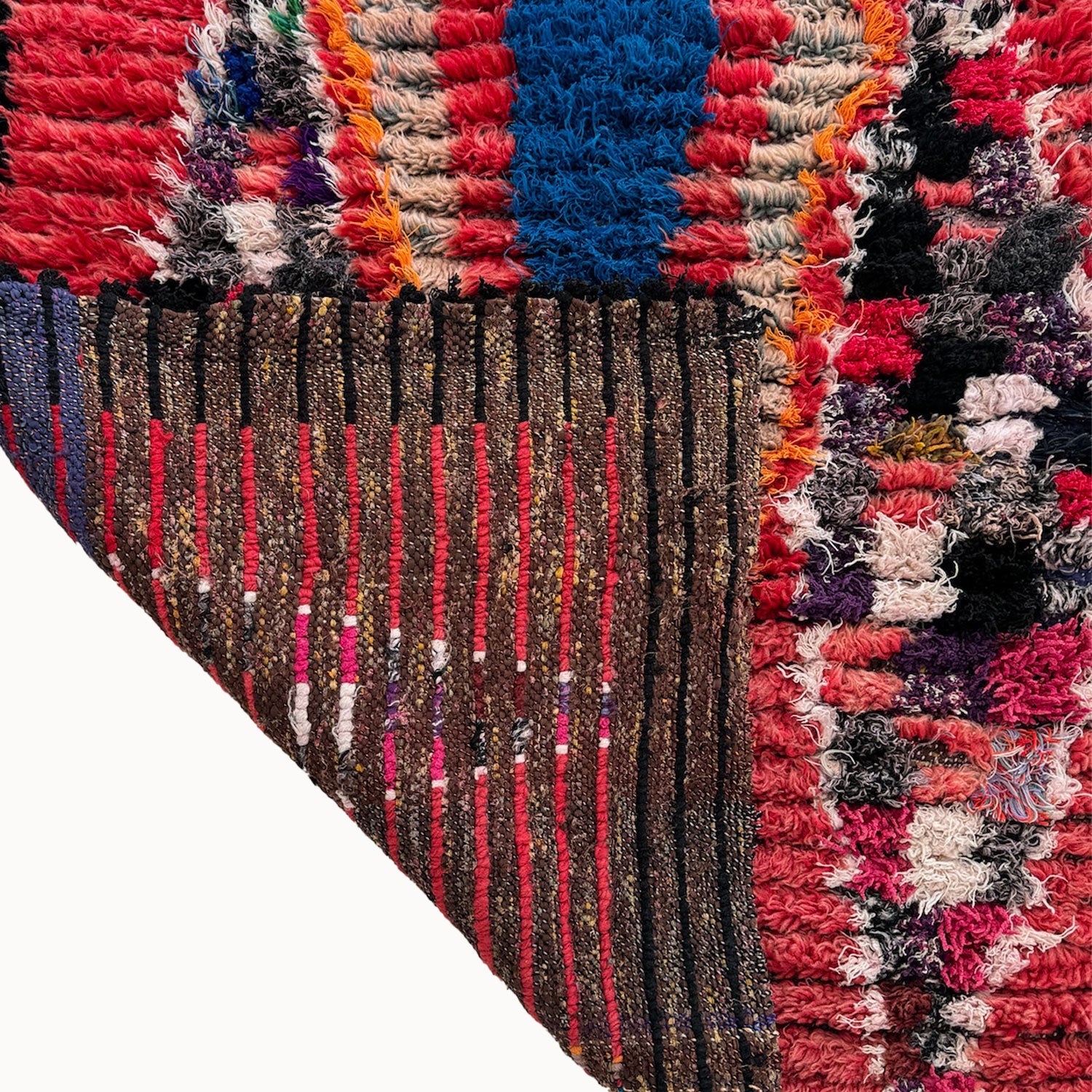 - Hand-knotted in the Atlas Mountains of Morocco using traditional Amazigh weaving techniques.