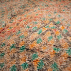 Infuse your home with the vibrant spirit of Morocco through this exquisite vintage rug. The rich hues of orange and multicolor wool evoke warmth and texture, perfect for making your living space feel inviting and unique.
