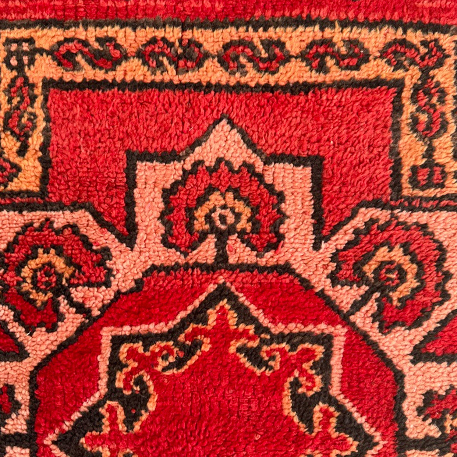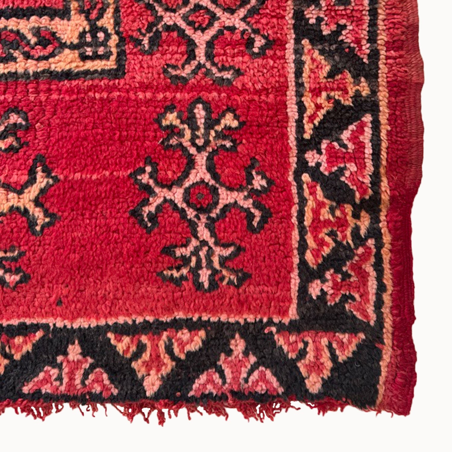 Transform your living area with the bold colors and rich history of the Chaz Vintage Moroccan Rug. Measuring 3'9" x 5'9", this exquisite rug features a captivating red and black palette, handwoven from durable wool, ensuring both style and longevity. With an estimated age of 20-30 years, it carries a story that adds character to your home.