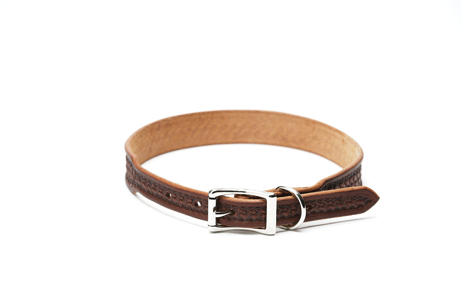 Your canine companion will strut in style with this exquisite chocolate basket dog collar from Texas Saddlery. Beautifully handcrafted from premium leather, its softness ensures comfort while maintaining durability that withstands the most adventurous tails. This collar is designed to fit snugly without any bulk, making it a perfect fit for every playful pup.