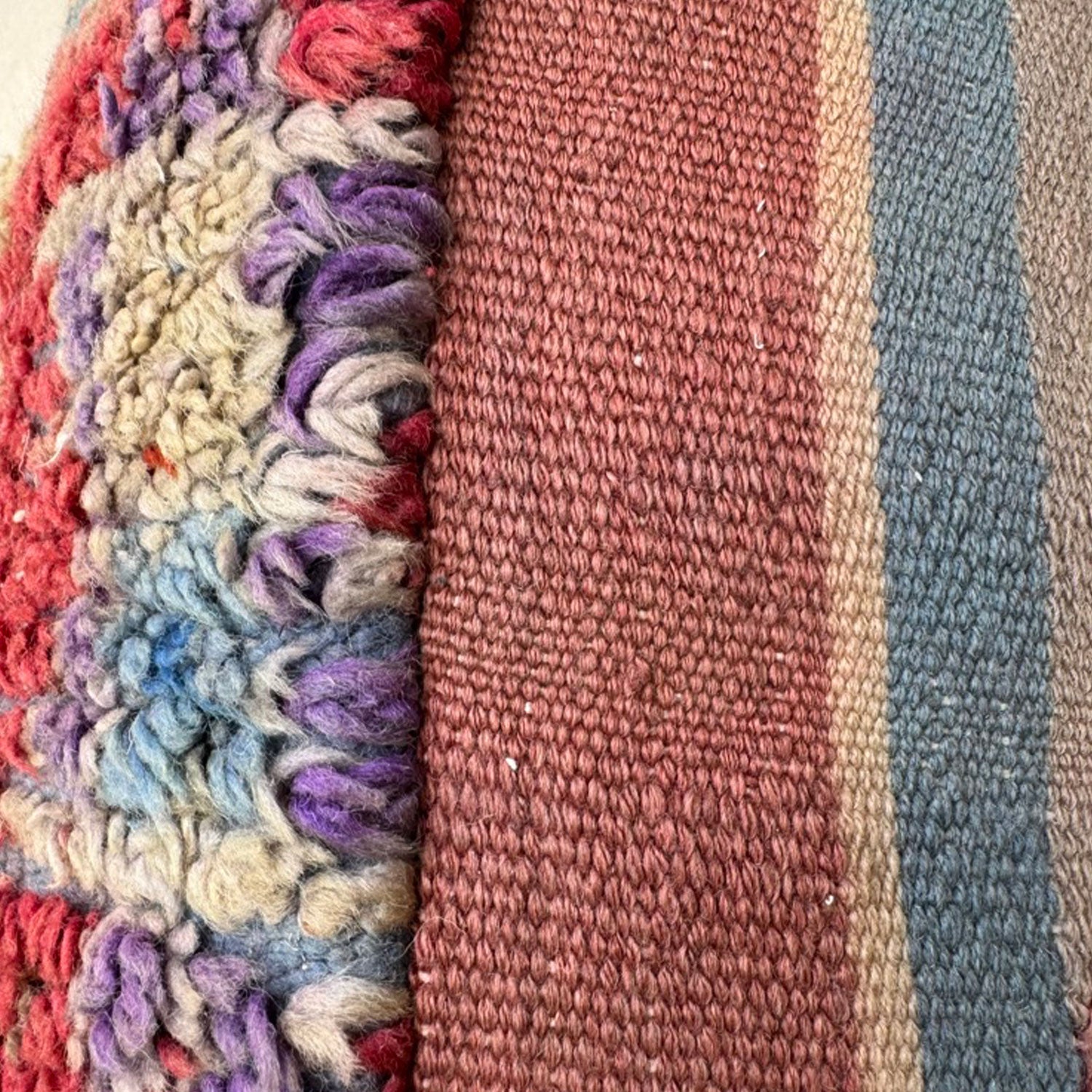 - Materials: Handwoven Moroccan rug fragments