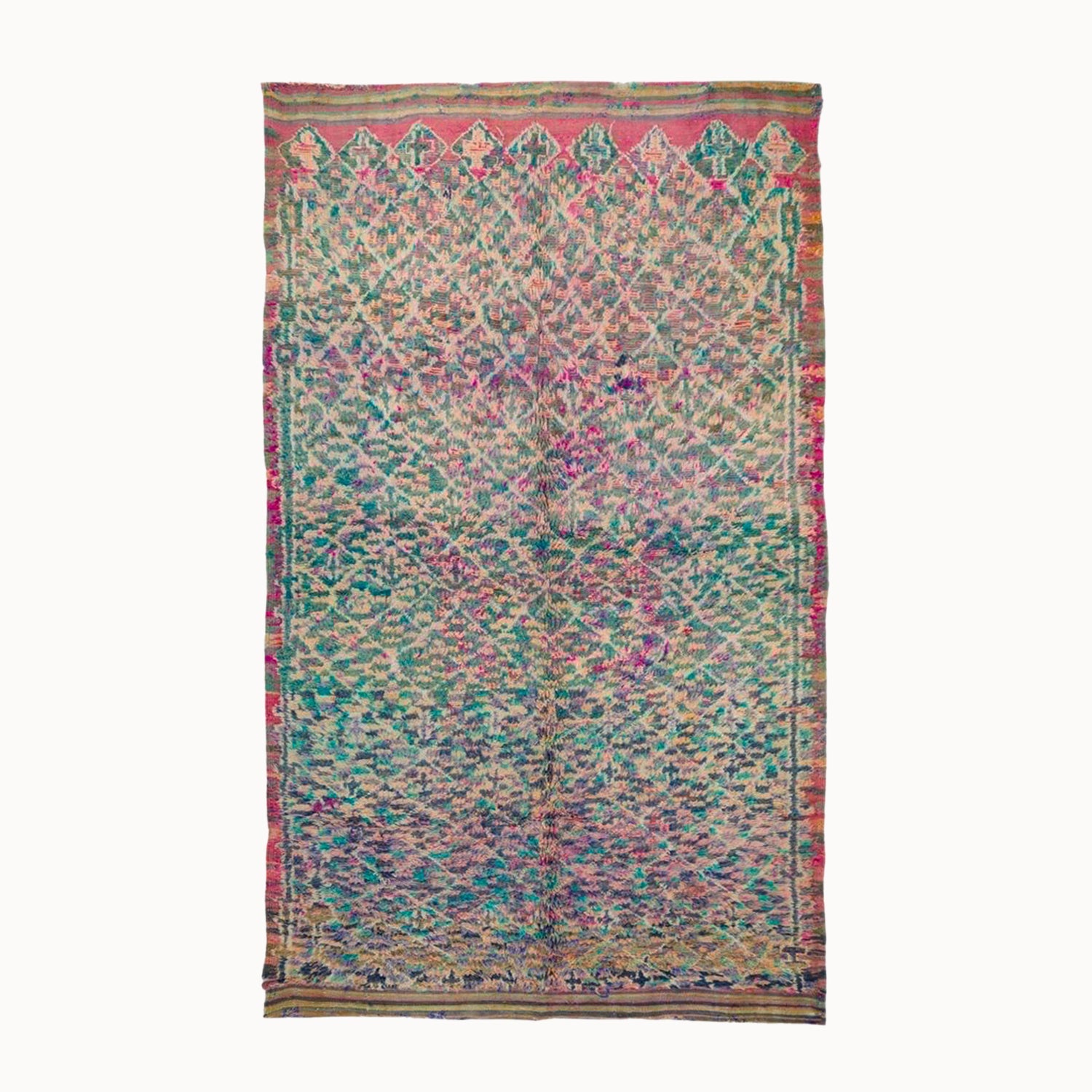 Discover the warmth and artistry of the Dev Vintage Moroccan Talsint Rug, a stunning piece that brings together rich history and modern aesthetics. With vibrant purple and green hues, this hand-spun wool rug adds an exquisite touch to any room, creating a cozy atmosphere reminiscent of Texas hospitality.