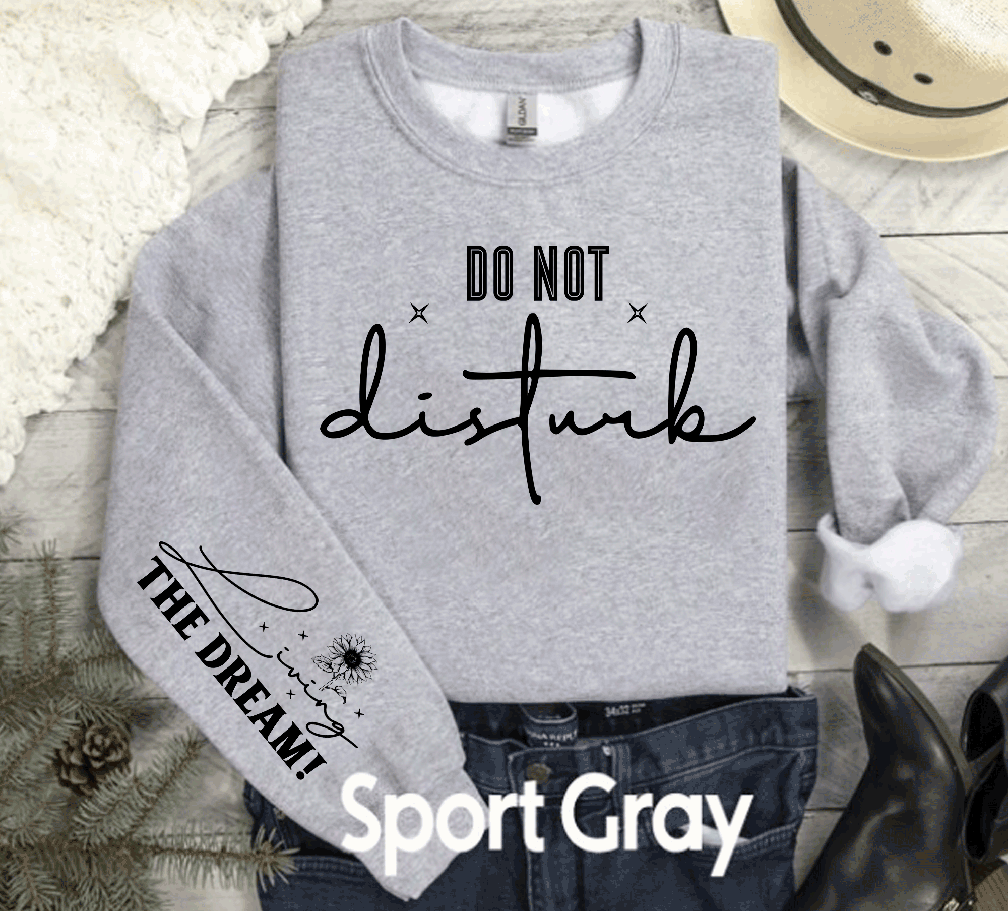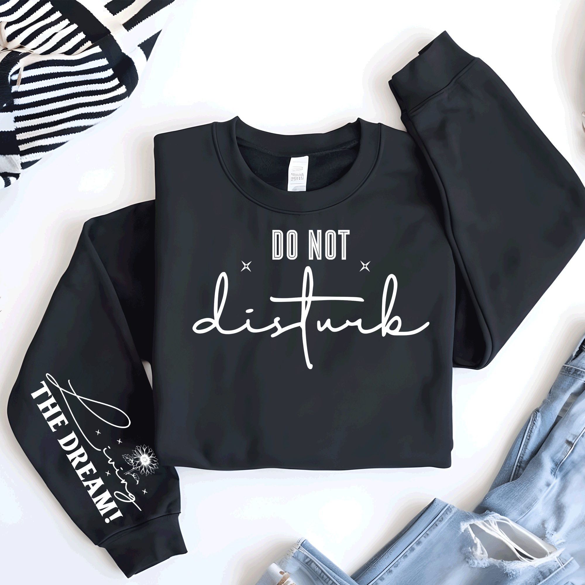 This 'Do Not Disturb, Living the Dream' sweatshirt serves as a gentle reminder of the importance of self-care and personal space. The cozy fabric and motivational message make it a perfect companion for those seeking comfort and positivity in their daily lives.
