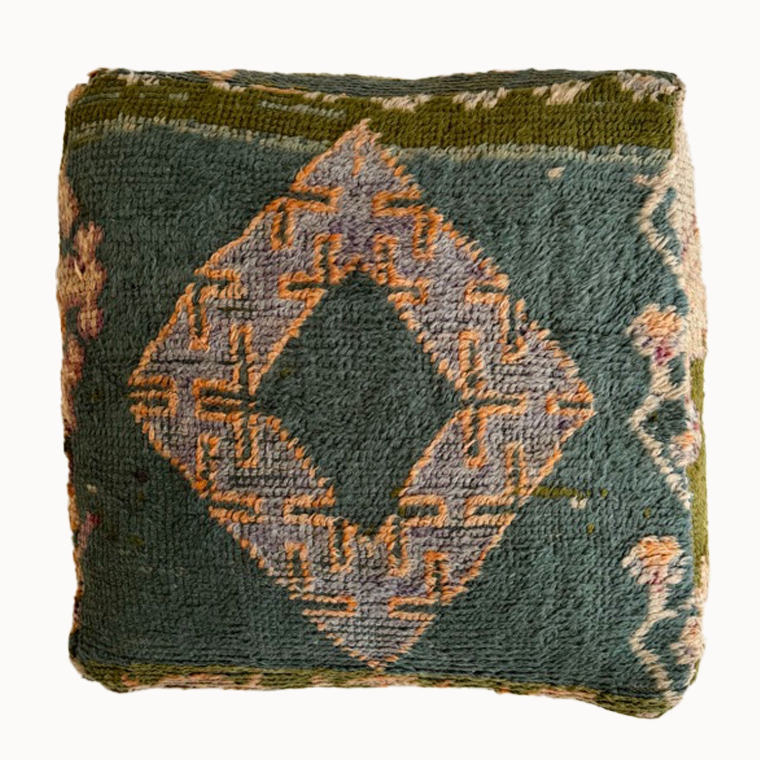 A soft pouf handcrafted out of a vintage Moroccan rug. These can be used as a comfortable seat or a cozy place for your pet to lay.