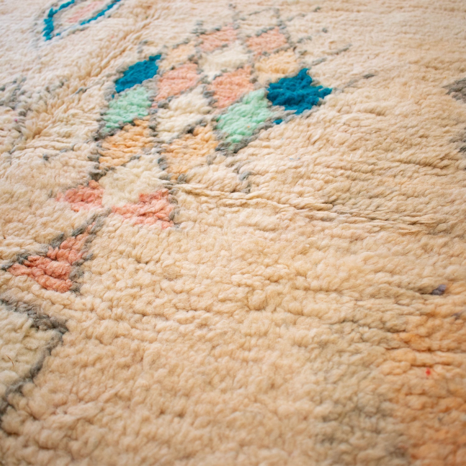 This exquisite hand-knotted rug brings a touch of Moroccan sophistication to your floor. With its earthy tones of beige and vibrant multicolor accents, it serves as a centerpiece that invites warmth and comfort into any room, perfect for both modern and traditional settings.