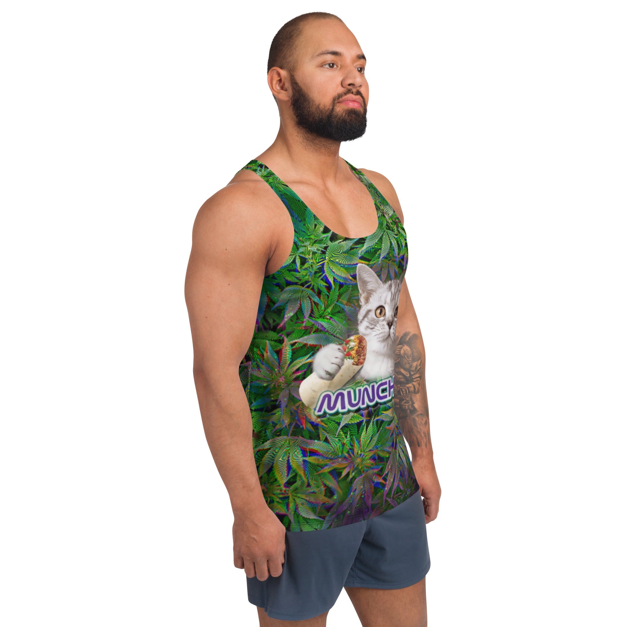 Celebrate your playful side with this vibrant Munchies Cat tank top from BigTexFunkadelic. Featuring a fun and colorful design, this tank is perfect for warm weather outings and laid-back gatherings. Made from a soft and stretchy blend, it provides a comfortable fit that suits a variety of activities, from lounging at home to hitting the festival scene.