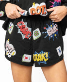 Introducing the Queen of Sparkles Black Mahjong Icon Short. This sleek and stylish garment features a bold black color and a unique mahjong icon design. Made with high-quality materials, it offers both comfort and fashion to elevate your wardrobe. Embrace the elegance and confidence of this must-have item. Model is wearing an XS