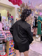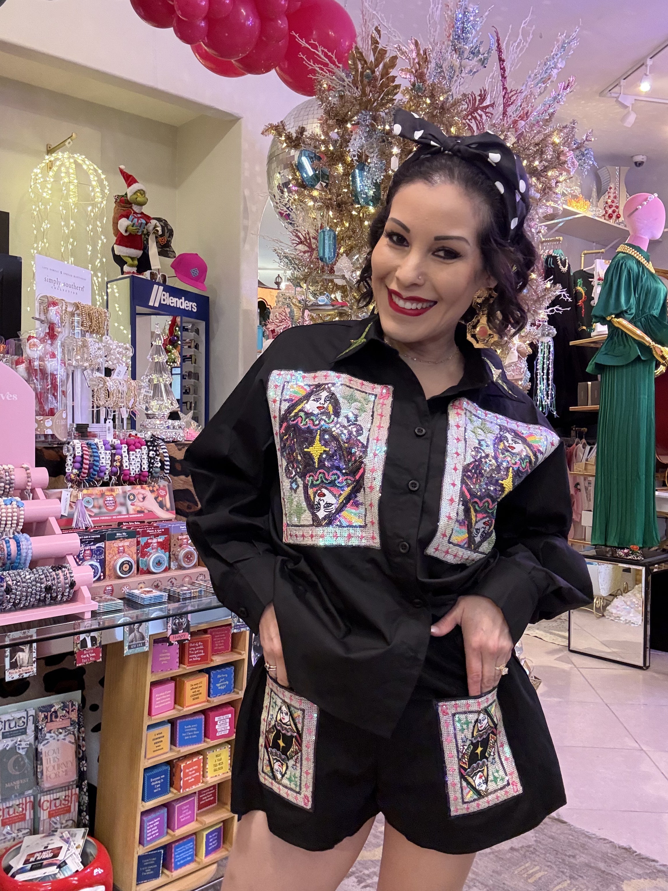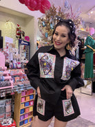 Be the queen of style and comfort with our Queen of Sparkles Black Queen Card Cotton Shorts! Made with soft cotton, these shorts feature a playful twist with a queen of hearts card design. Stay cool and chic in these unique and quirky shorts. Model is wearing an XS