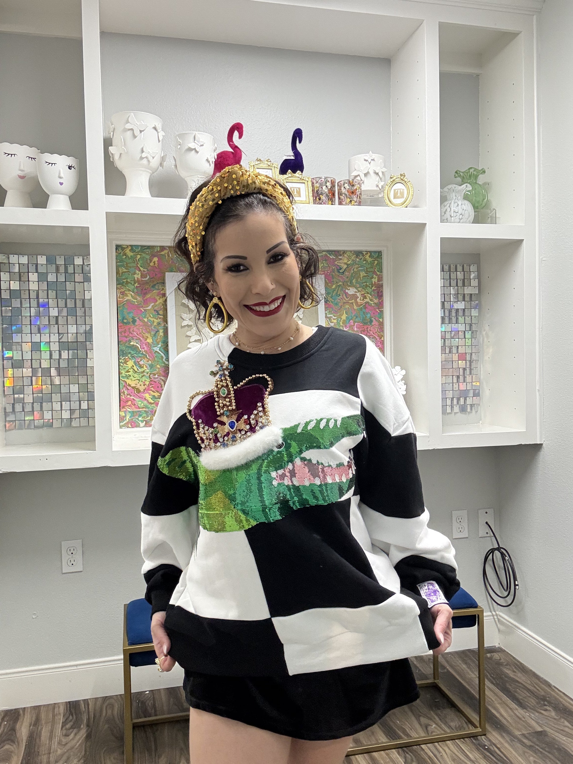 Embrace your inner queen with this cozy Black & White Checkered Alligator Sweatshirt. The bold pattern and striking alligator graphic make a statement that showcases your unique style while keeping you comfortable during casual outings.
