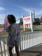 Turn heads with these playful shorts that feature a quirky black and white seafood-on-newspaper print. The lightweight fabric is perfect for warm Texas days, adding a dash of humor and coastal charm to your summer wardrobe.