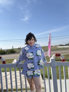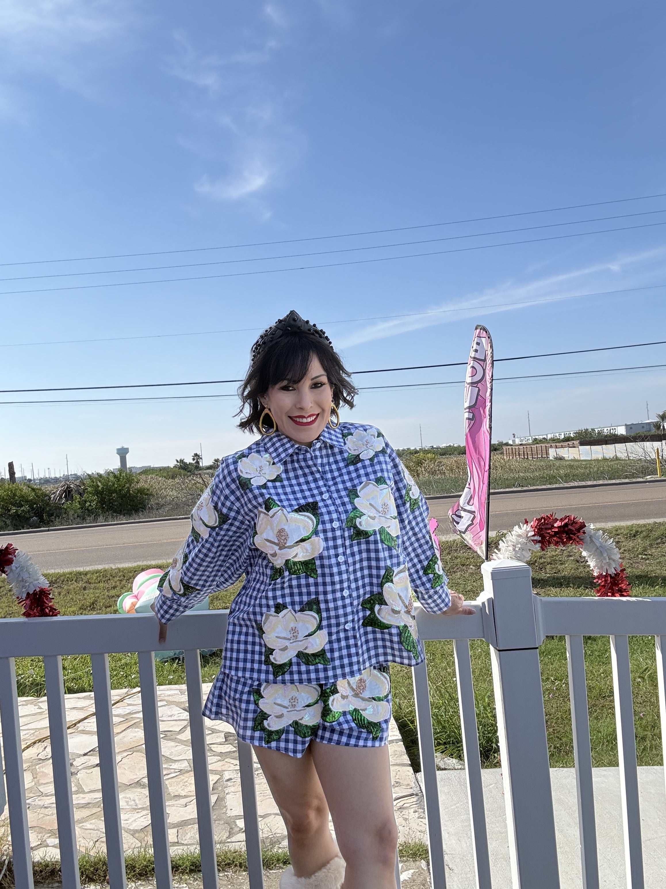 Bring effortless charm to your wardrobe with this delightful button-up top featuring a classic blue and white checkered pattern adorned with scattered magnolia blooms. Perfect for mixing casual elegance with a touch of whimsy, this piece transitions seamlessly from brunch dates to weekend adventures. The crisp checkered design paired with romantic floral accents creates a look that's both timeless and playfully on-trend. Dress it up with tailored trousers or keep it relaxed with your favorite denim—either way, you'll radiate that queen-of-sparkles confidence. Model is wearing an XS