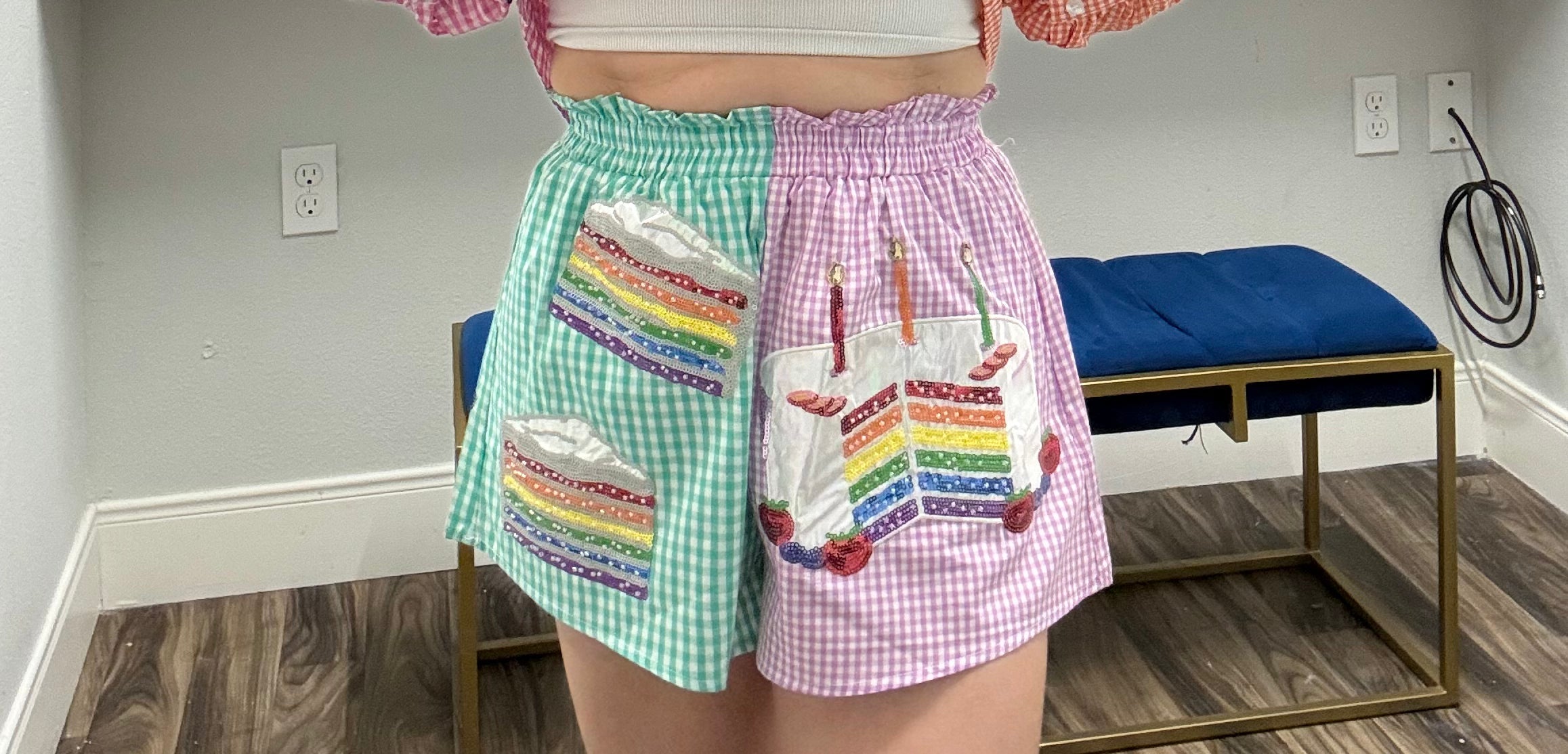 Celebrate in style with this vibrant Colorblock Gingham Rainbow Birthday Cake Sutton Up Short from Queen of Sparkles! Featuring bold, cheerful color blocking and playful gingham patterns, this piece brings festive energy to any occasion. The rainbow-inspired design captures that birthday cake magic with its sweet, eye-catching aesthetic. Perfect for those who love standing out and spreading joy wherever they go. Whether you're hitting a party or just want to feel extra special, this short delivers personality and pizzazz in every wear. Model is wearing an XS