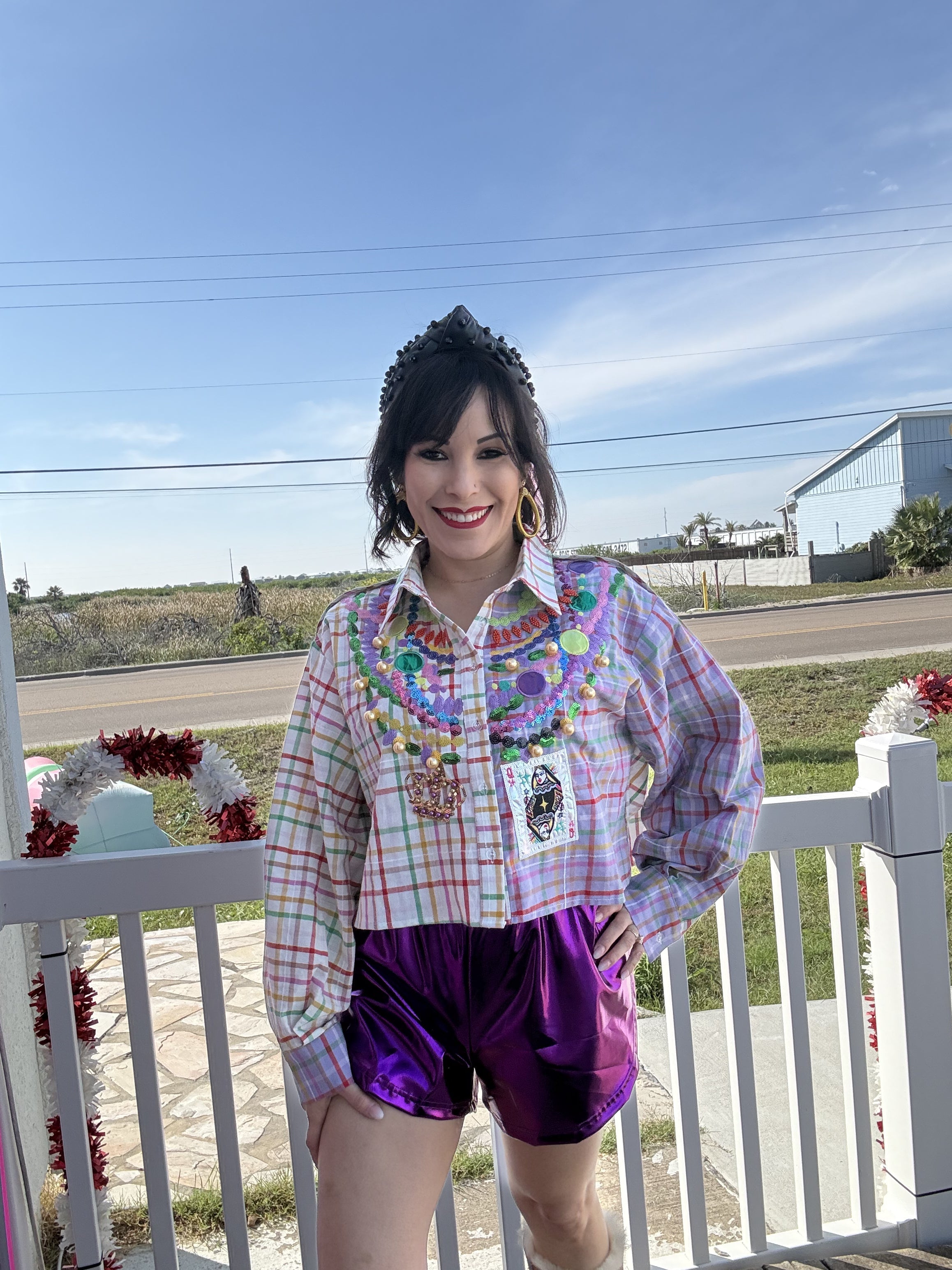 Celebrate in style with this show-stopping button-up top featuring bold colorblock plaid panels and eye-catching Mardi Gras beads sewn right into the fabric. Perfect for festival season, themed parties, or anyone ready to bring the fun and sparkle to their wardrobe. The playful mix of colors and festive beading makes this piece an instant conversation starter that demands attention. Dress it up or down—this versatile top brings instant personality and party vibes to any outfit.