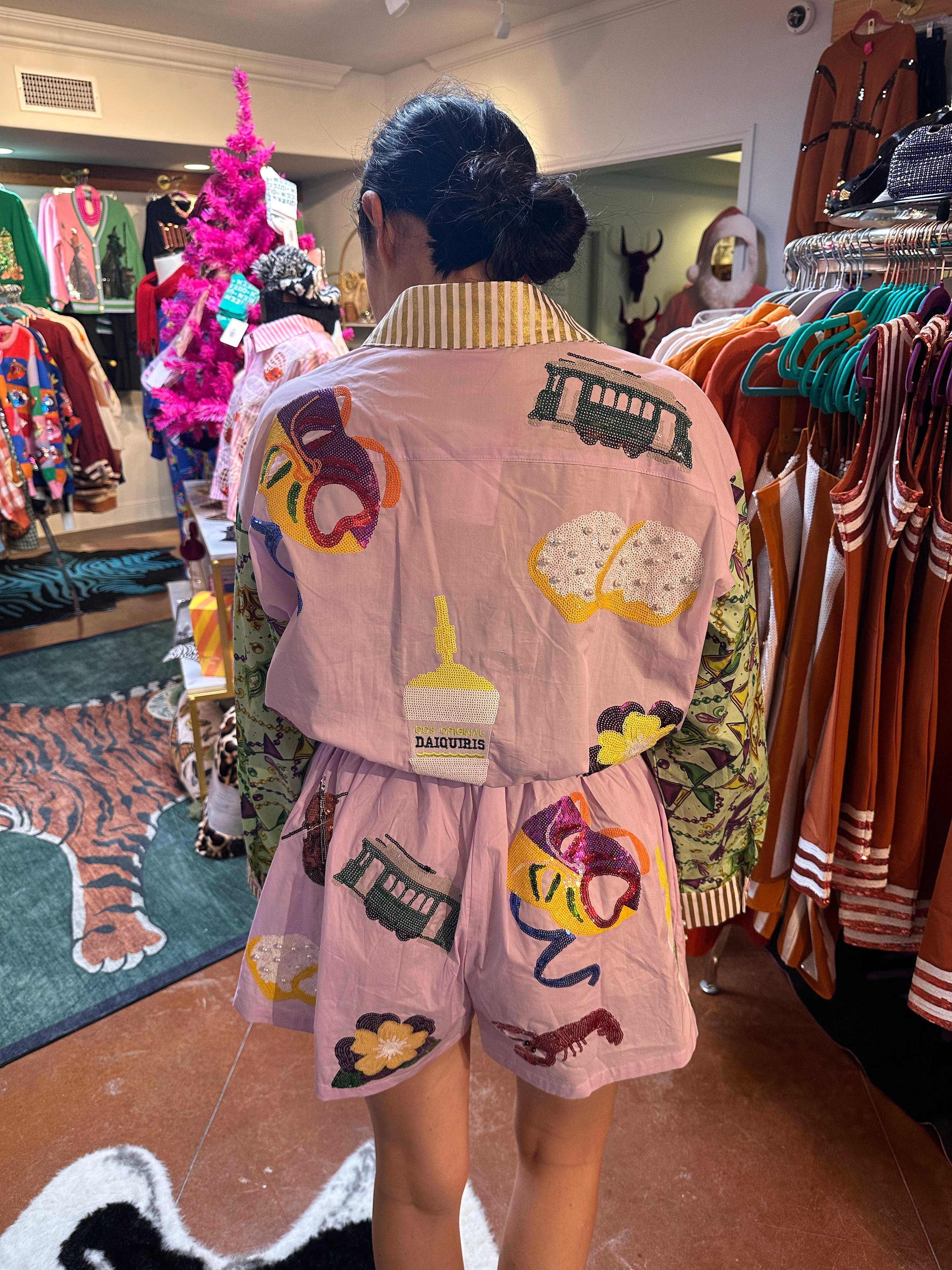 "Rule the Mardi Gras festivities in our Queen of Sparkles romper! Featuring a playful colorblock design and fun Mardi Gras icon buttons, this romper will have you standing out in the crowd. Perfect for a day of fun and celebration, this romper is sure to bring the party wherever you go!"