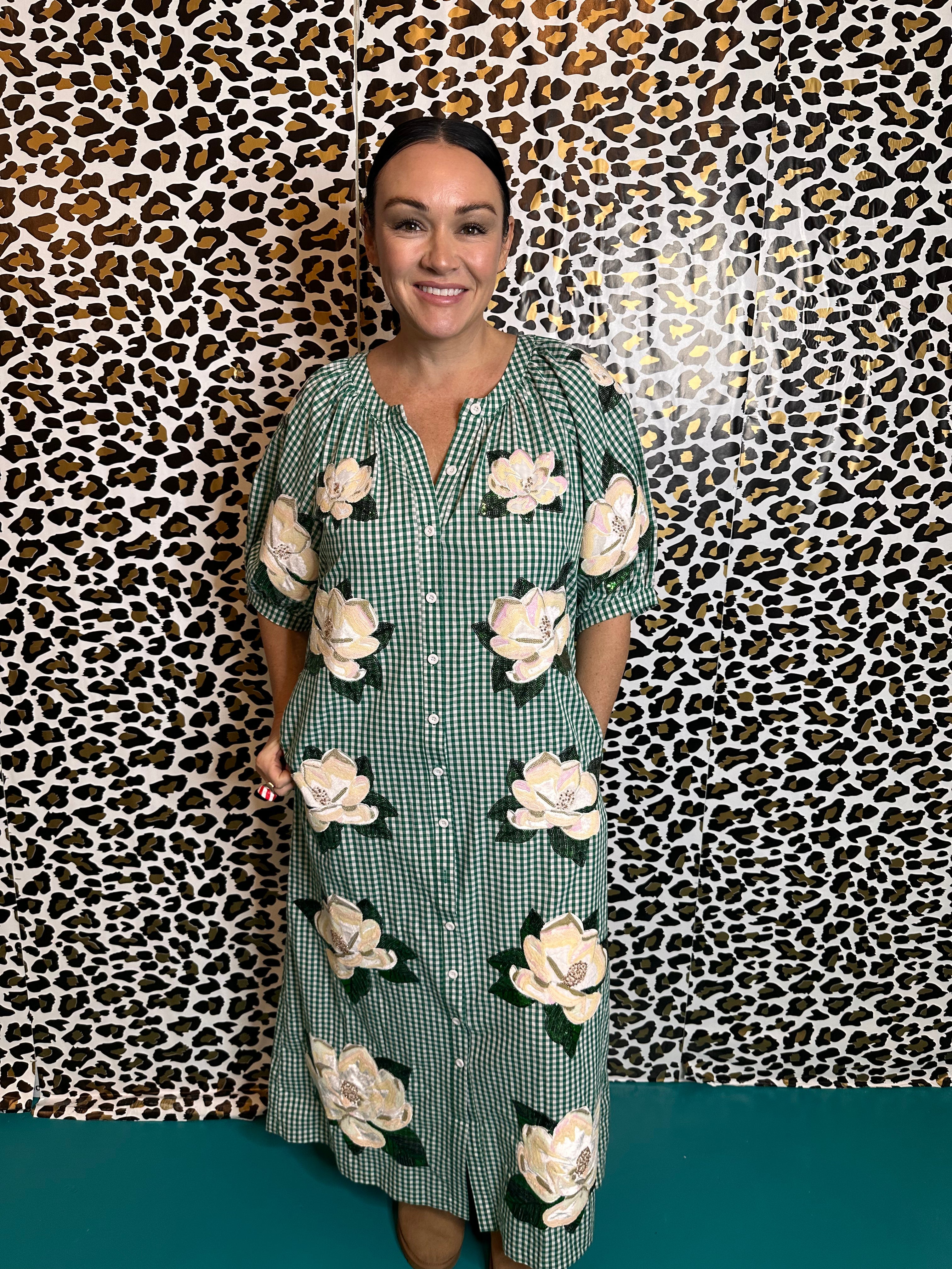 Twirl into every spring gathering in this charming midi dress featuring a classic green and white gingham pattern and lovely magnolia button details. The airy cotton fabric ensures comfort, while the vintage-inspired design keeps you looking timelessly chic. Whether dressed up with heels for a garden party or paired with sneakers for a casual day out, this dress is a versatile standout.