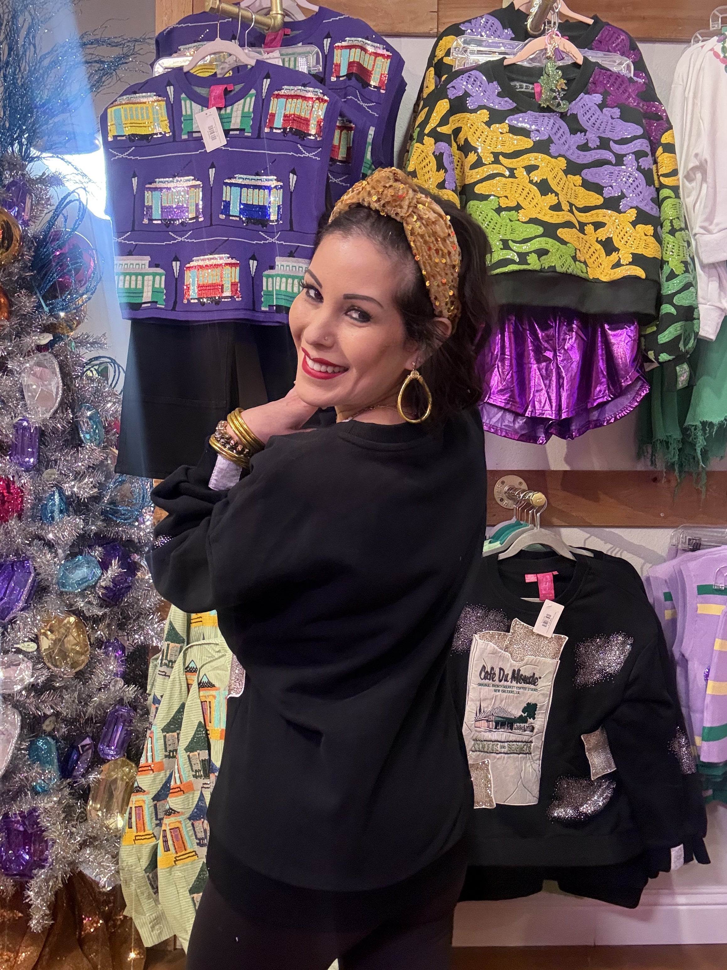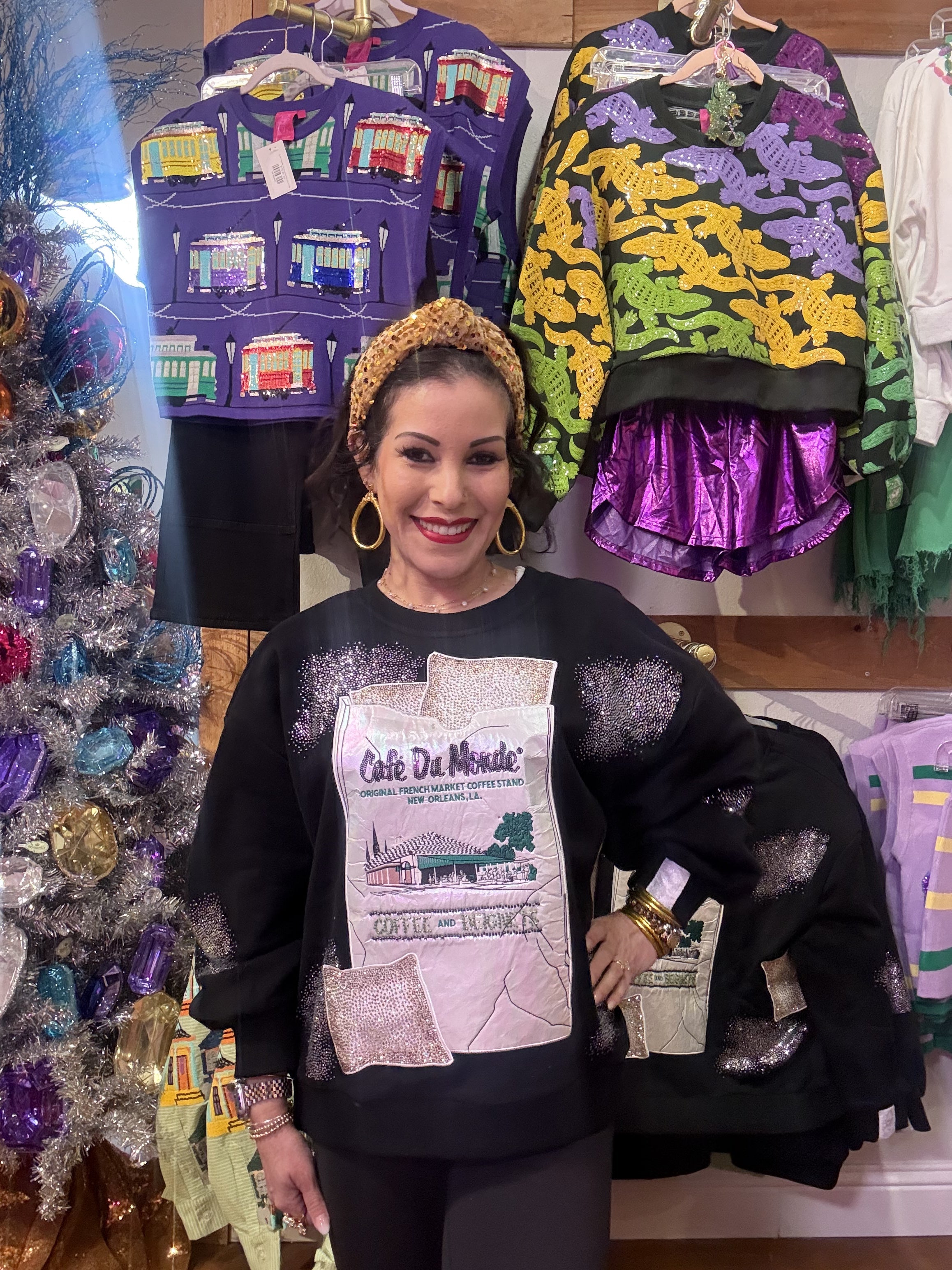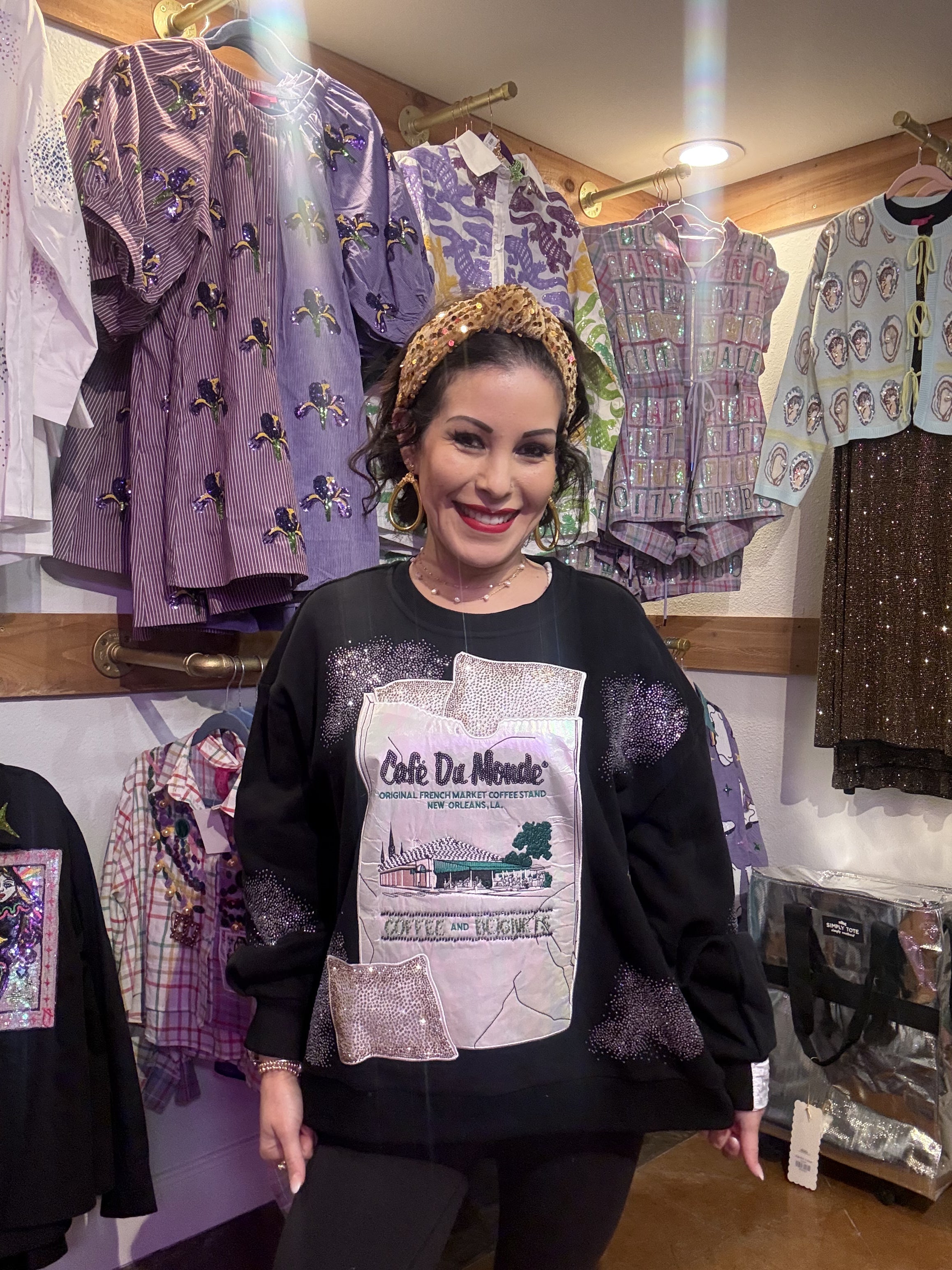 Indulge your inner beignet lover with this whimsical Queen of Sparkles sweatshirt, officially licensed by the iconic Cafe Du Monde. Featuring a charming design that celebrates New Orleans' most beloved treat, this cozy piece pairs perfectly with your coffee runs and casual adventures. The playful graphics capture the magic of powdered sugar-dusted beignets and signature café vibes, making it an instant conversation starter. Soft, comfortable, and unapologetically fun—because life's too short not to wear your love of French Quarter classics. Model is wearing an XS