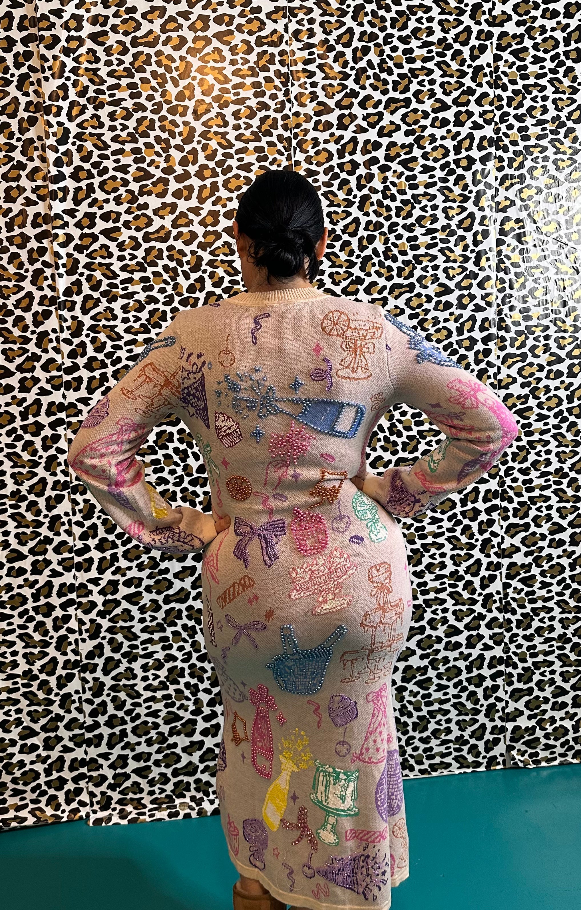 Be the queen of sparkle on your special day with our light pink birthday icon knit dress! This knit dress features charming birthday icons, perfect for birthday celebrations or any occasion. Show off your playful side in this unique and stylish dress. (Sparkles not included.)