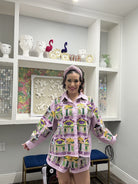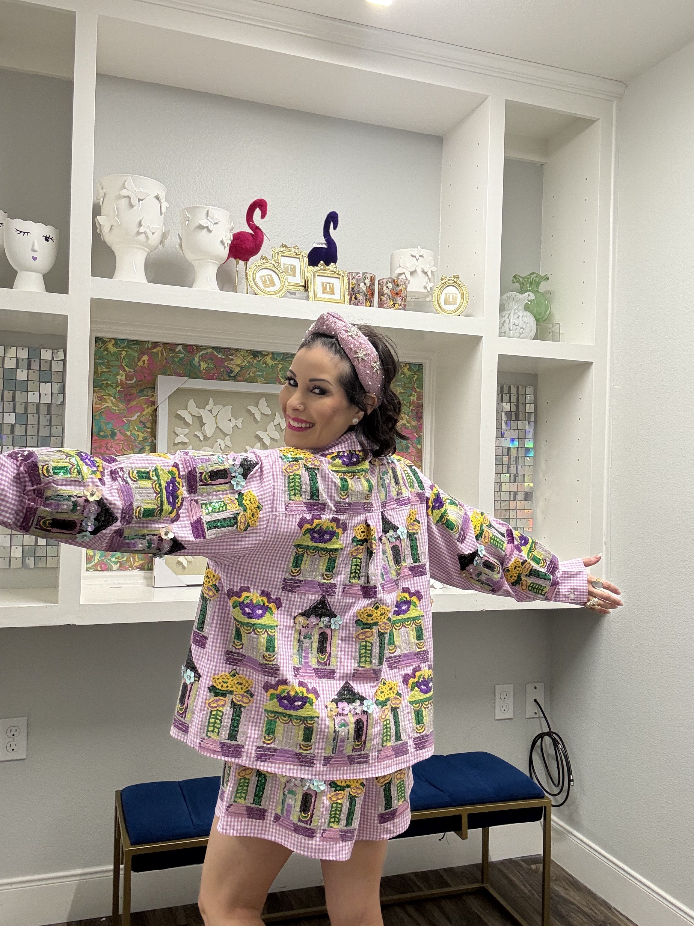 Bring the party to your porch with this dazzling Queen of Sparkles button-up top! Featuring a bold purple and white diamond pattern that screams Mardi Gras magic, this piece is perfect for celebrating in style—whether you're hosting or just soaking up the festive vibes. The sparkly details catch the light beautifully, making you the center of attention. Comfortable enough for lounging but fabulous enough to turn heads, this top is your ticket to looking like royalty all season long. Let the good times roll! Model is wearing an XS