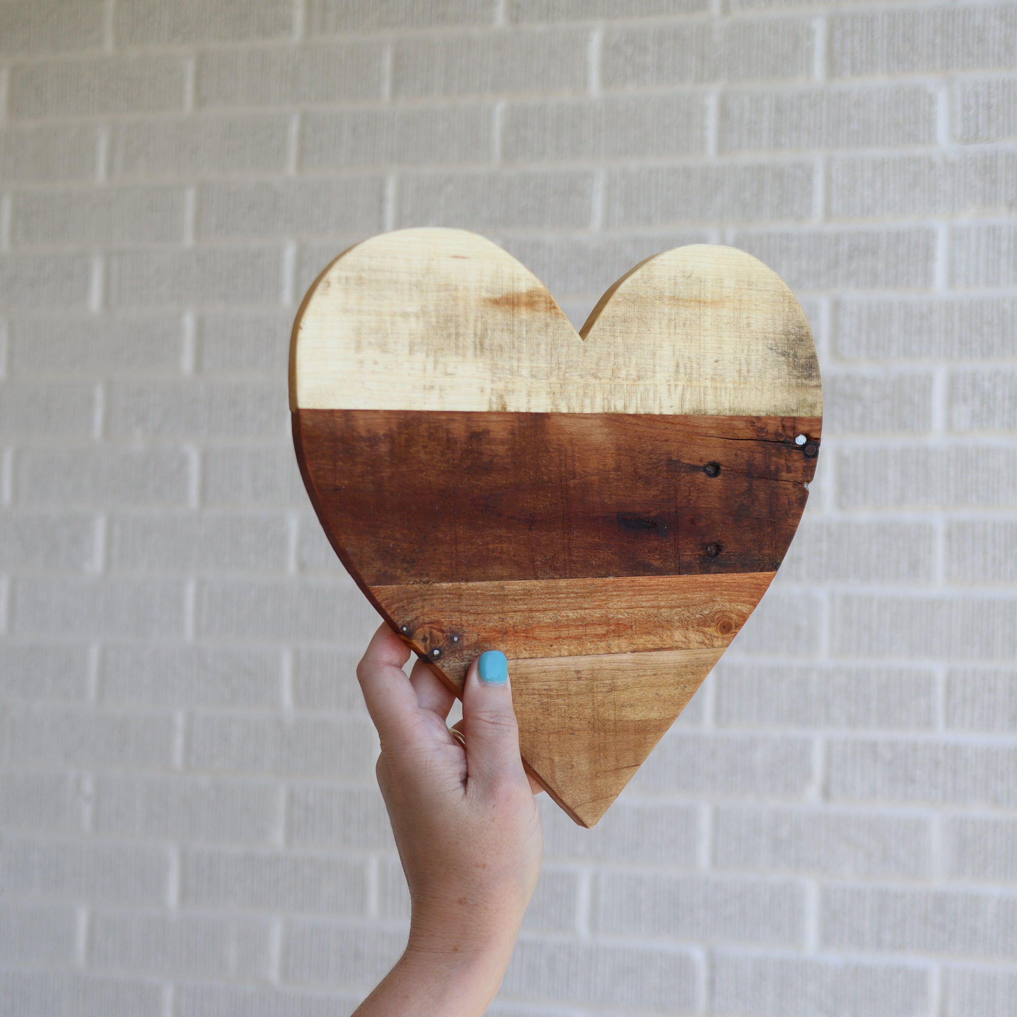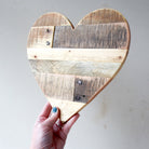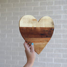 We're making these beautifully rugged Hearts with reclaimed pallet wood and precise templates. Available in three sizes: Large, Medium, and Small. The small hearts are 6 x 6 x ½ inches, medium hearts are 10 x 10 x ½ inches, and large hearts are 20 x 20 x ½ inches.
