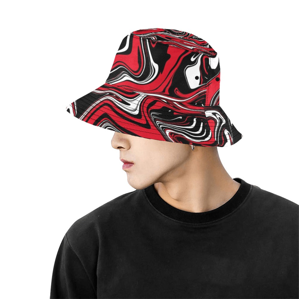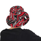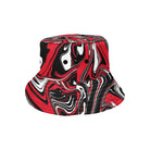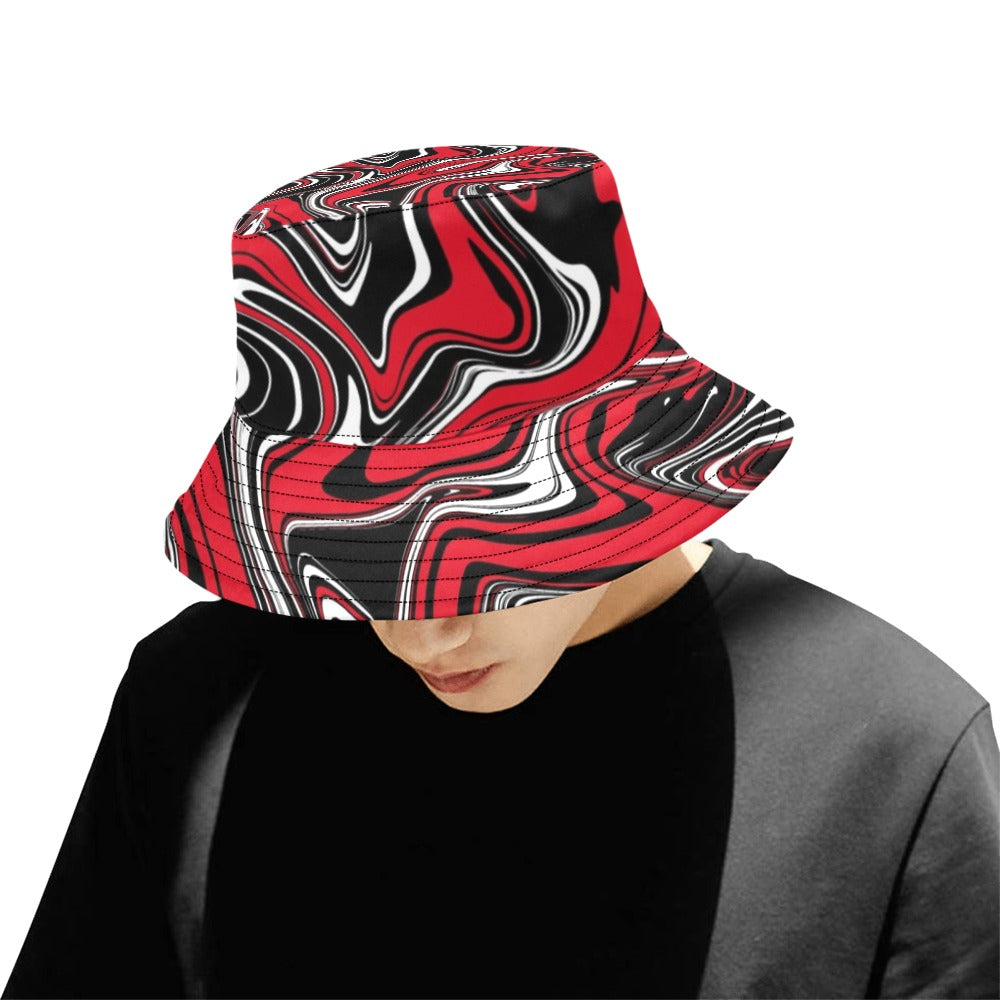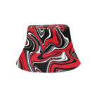 Red, black and white fluid art inspired all over print psychedelic bucket hat available from BigTexFunkadelic that is reversible; the flip side is solid black. Made from premium cotton, this classic accessory adds another layer of cool to your outfit.
