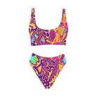 This rave inspired orange and purple abstract print bikini set by BigTexFunkadelic™️ features a scoop neck and low back sport bikini top, and high waisted bottoms with high leg. It is a must-have item for your next trip to the pool.