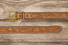 Introducing our Western Belt in Saddle Tan Floral, meticulously handcrafted from genuine leather to add a touch of Western elegance to your ensemble. The classic saddle tan hue of the leather, adorned with intricate floral detailing, exudes a timeless charm and sophistication. Crafted with precision and care, this belt showcases the superior quality and craftsmanship of authentic leather goods. The Western-inspired design and sturdy construction make it a versatile and stylish accessory for any Western look. Elevate your attire with our Western Belt in Saddle Tan Floral, a refined and eye-catching piece that embodies the essence of Western tradition with a touch of floral beauty.