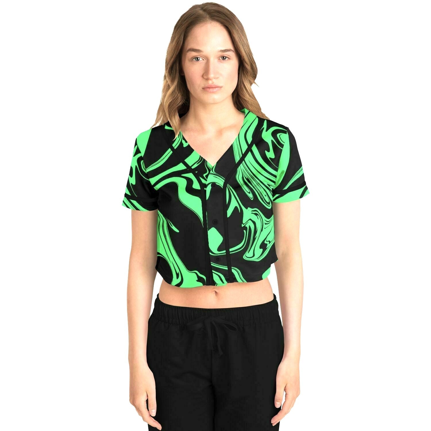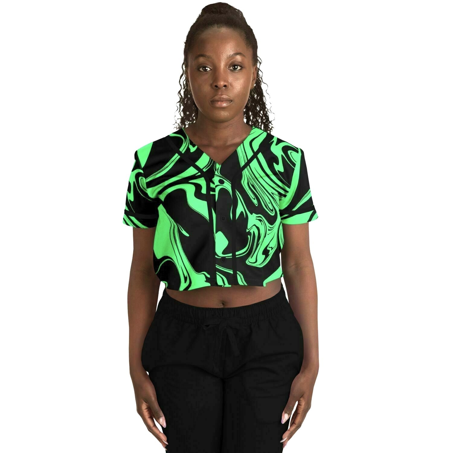Step up your game day style with this eye-catching cropped baseball jersey from BigTexFunkadelic. The unique green and black oil spill design is not only visually stunning but also perfect for making a statement during your favorite sporting events. Made with quality materials, this jersey ensures comfort and flair, keeping you stylish whether you're in the stands or out with friends.
