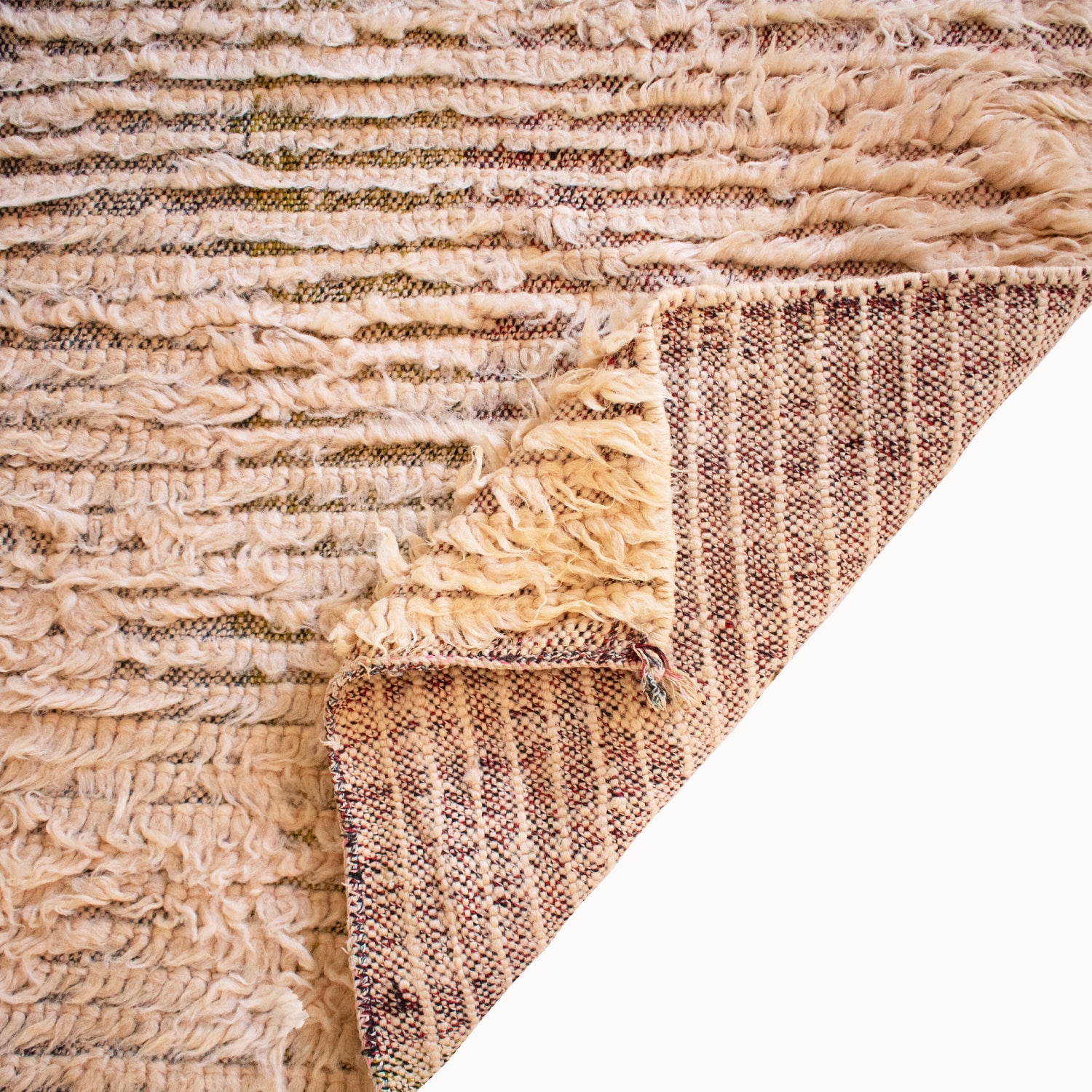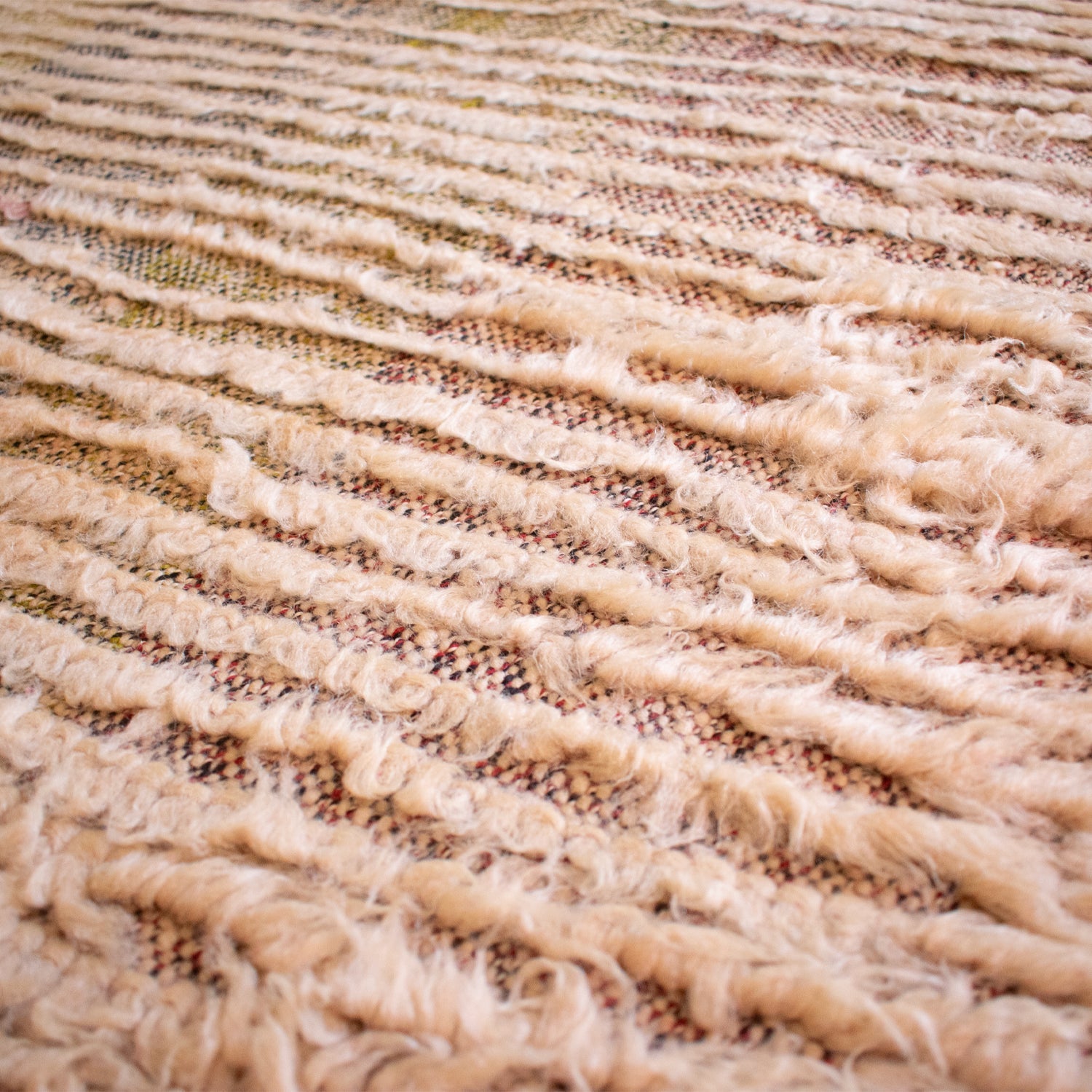 - Hand-knotted in the Atlas Mountains of Morocco using traditional Amazigh weaving techniques.