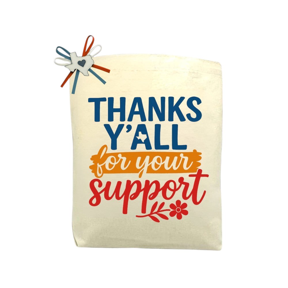 The Thanks Y’all For Your Support Tote Bag is a warm and genuine way to express appreciation with unmistakable Texas charm. Featuring a friendly, gratitude-filled message, this tote blends heartfelt sentiment with everyday practicality, making it ideal for carrying daily essentials while sharing a simple thank-you that feels personal and sincere. Perfect for customer appreciation, events, community support, or thoughtful everyday gifting, it offers a reusable accessory that reflects kindness, connection, and authentic Lone Star hospitality.