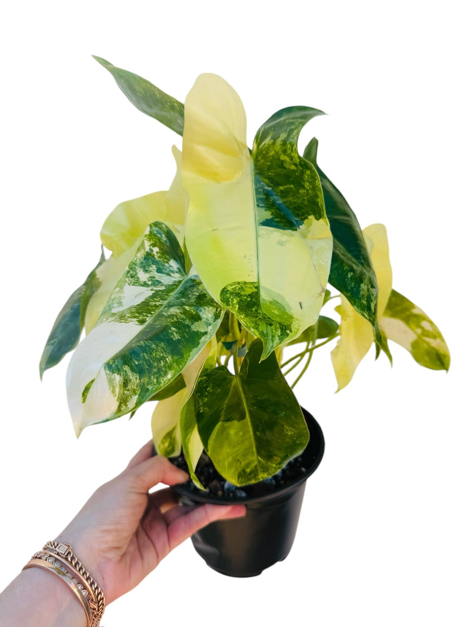 The Variegated Burle Marx is for sale at Plant Vault, an exotic plant known for its unique, striking foliage. This rare houseplant, a variegated form of the Philodendron Burle Marx, features wide, glossy leaves with a captivating mix of deep green and creamy white or yellowish variegation. The bold, marbled pattern is irregular and varies from leaf to leaf, creating a dynamic and visually appealing display. Native to the tropical forests of Brazil, the Variegated Burle Marx thrives in shaded, humid environments, making it perfect for indoor collections.