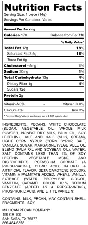 Packaged beautifully in a decorative gift box or available individually, these white chocolate pecan candies make fantastic pecan gifts for any occasion. Whether you're celebrating a special event or treating yourself, our handcrafted Caramillicans are sure to impress. Shop today at our orchard pecan country store and indulge in these irresistible pecan treats!